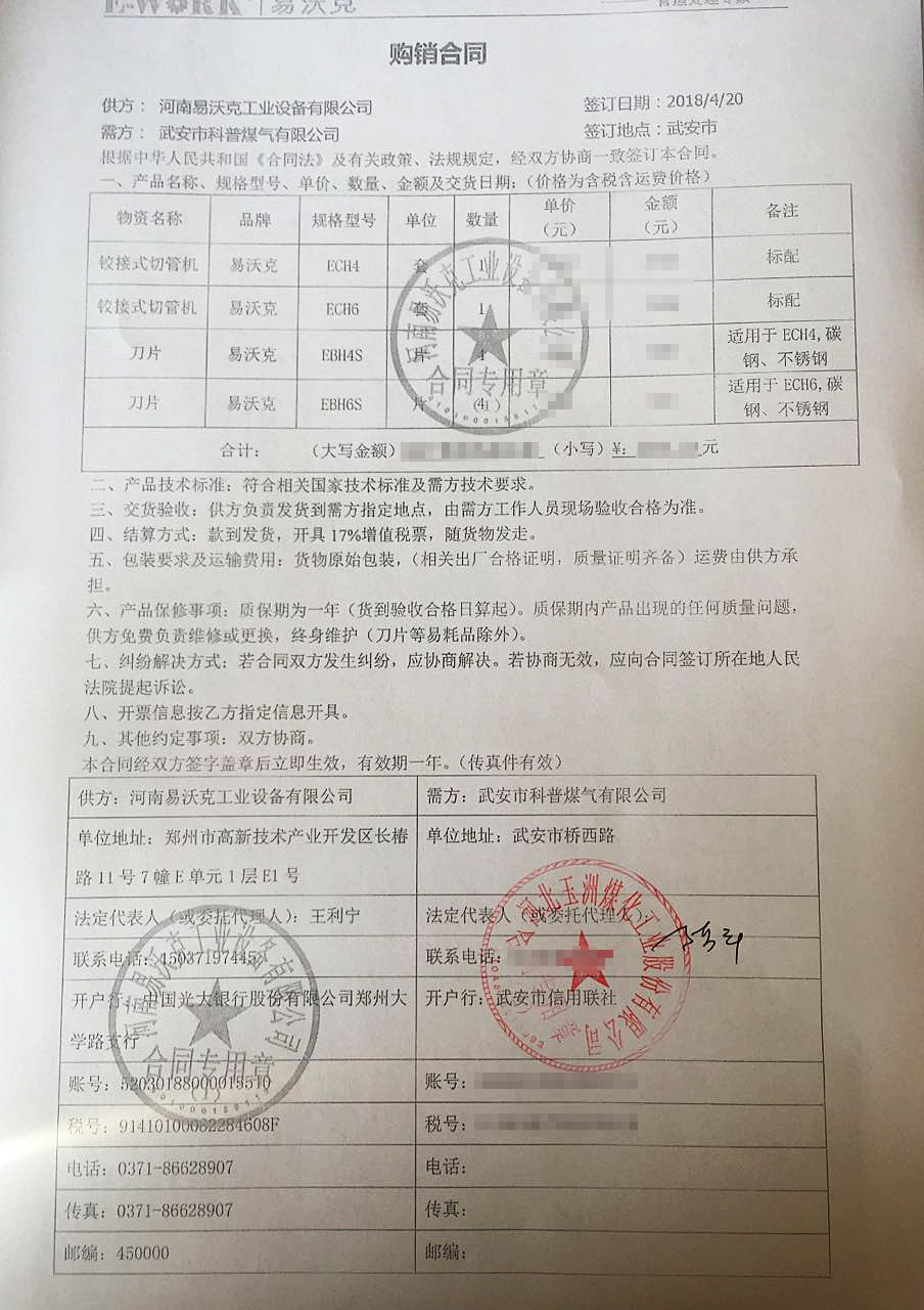 2018武安市科普煤氣公司購(gòu)買我公司鉸接式切管機(jī)2套